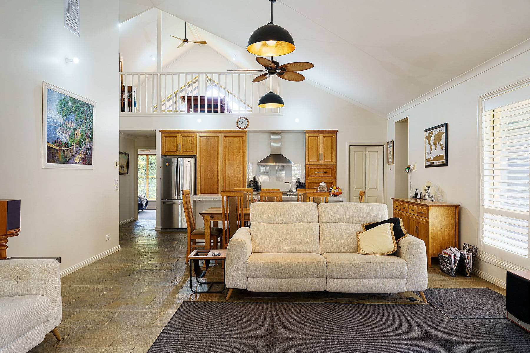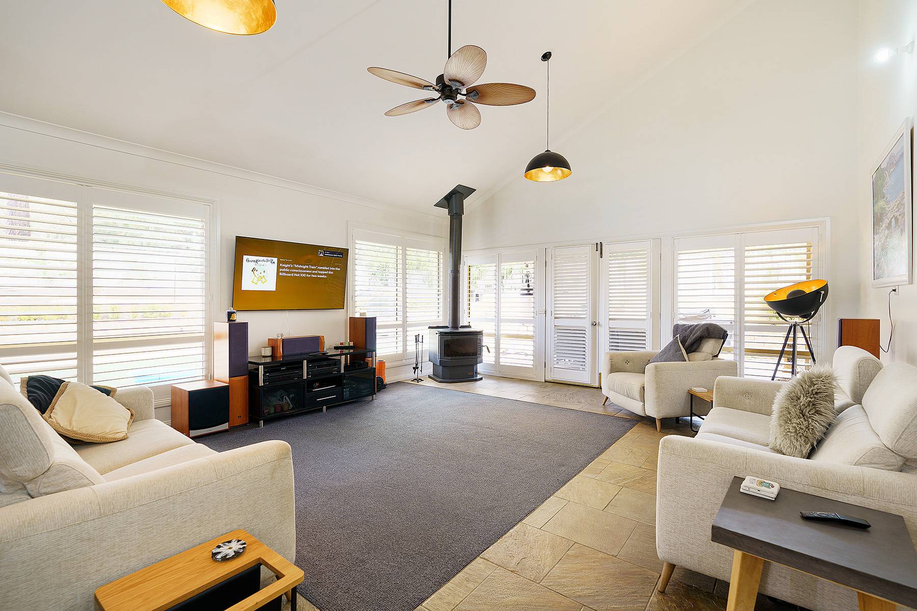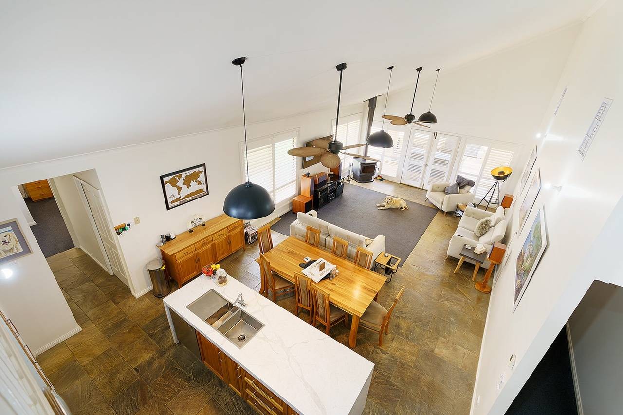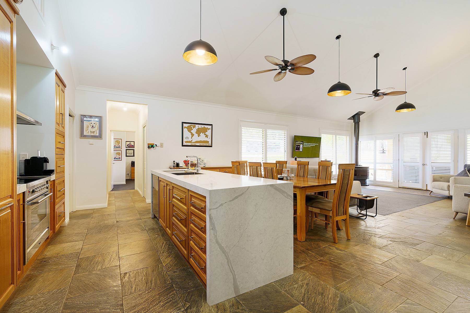 Moving forward will bring you to the atrium styled living and dining area combining the kitchen featuring Tasmanian oak cabinetry and stone benchtops. This main living area is also fitted with a Jindara, solid fuel fire place and also features genuine sandstone flooring, a luxury touch.