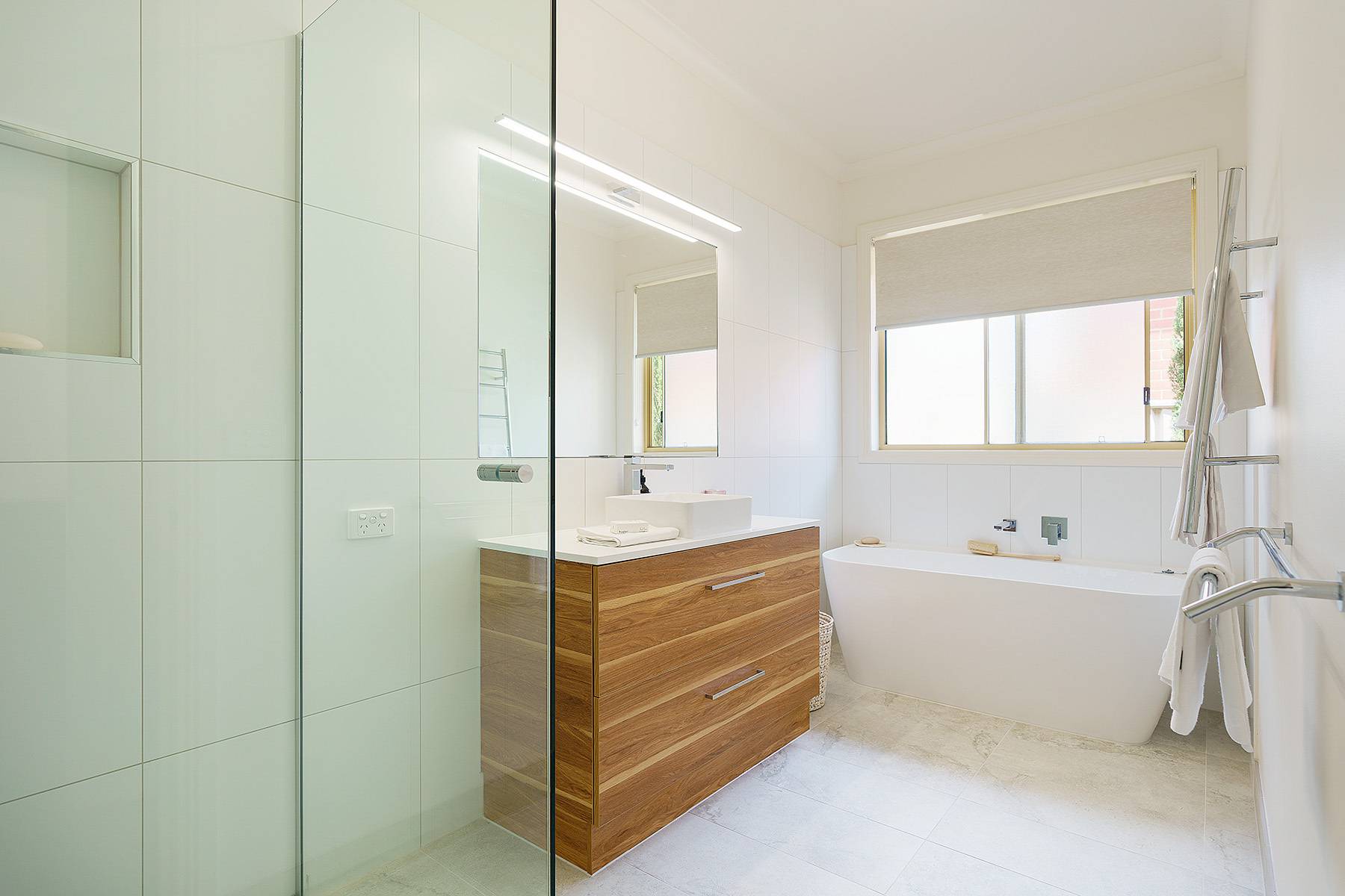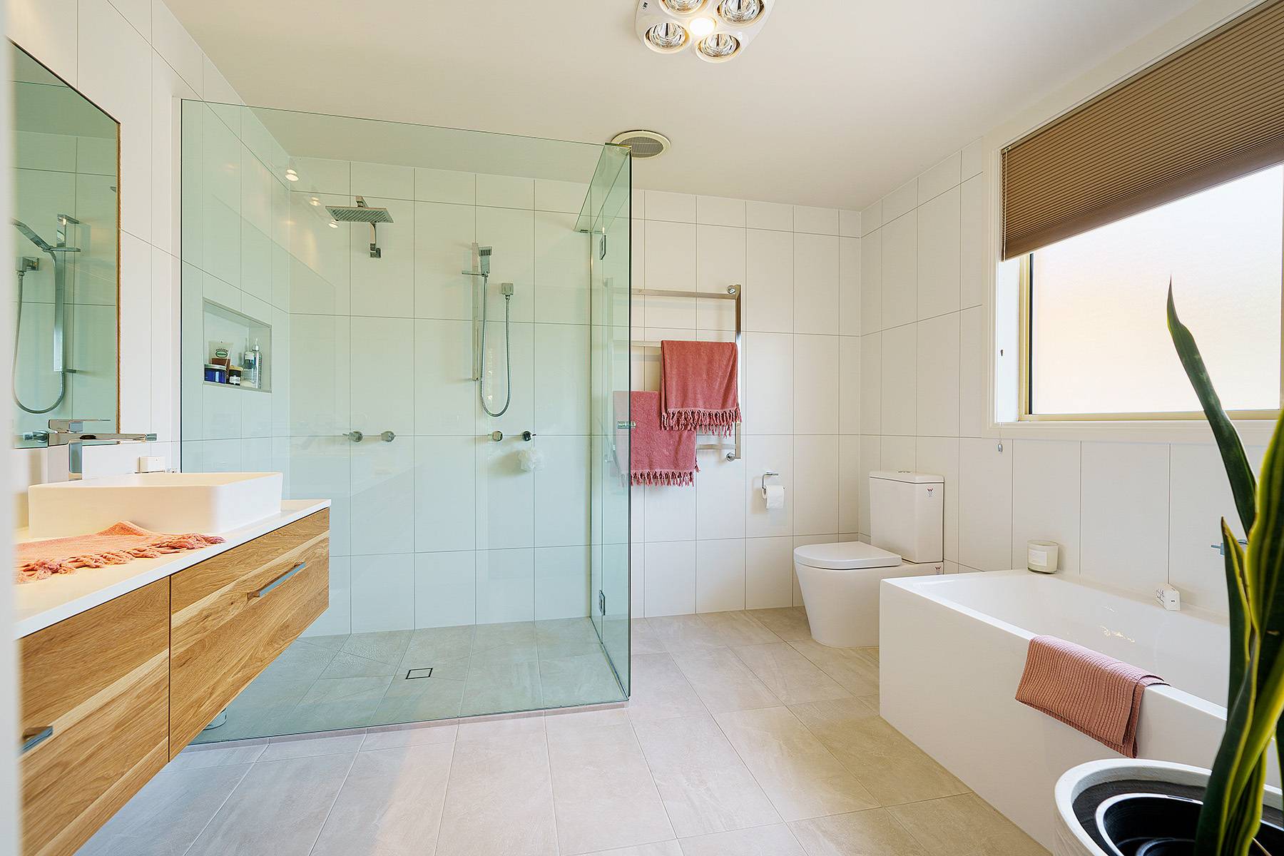 The Master bedroom is located off the front entrance hallway and is fitted with a large double access walk-in wardrobe. The full size ensuite features floor to ceiling tiles, a built in, full size bath, and a two person sized, glass shower recess. This as very spacious ensuite, reflective of the clever design choices of the owners.